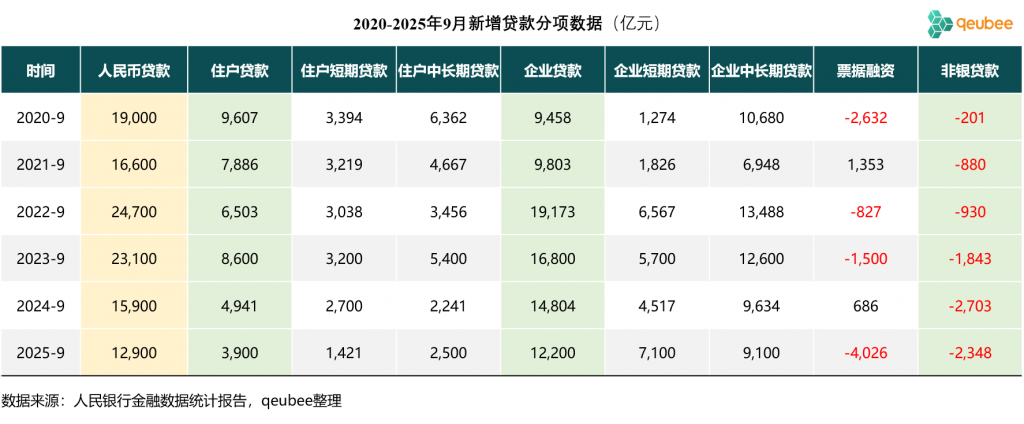 可以看到,尽管2025年9月新增贷款规模环比8月有改善,但依然处于过去五年最低水平,可见当前央行信贷目标已经很低。与2024年9月相比,2025年9月新增贷款区别主要集中在企业短期贷款和票据融资上,一增一减,住户贷款和企业中长期贷款增量小幅下降。