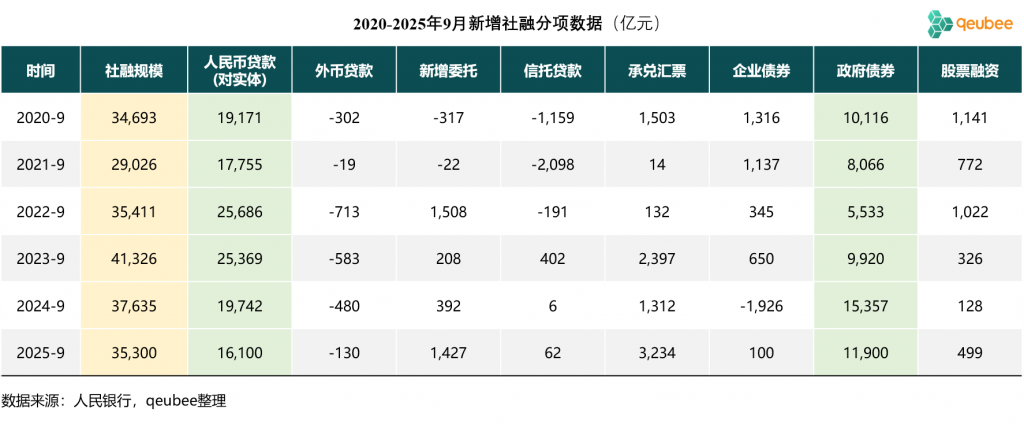 2025年9月份社会融资规模增量为3.52万亿元,比去年同期减少0.23万亿元。对9月社融增量进行细分,对实体经济发放的人民币贷款增加1.61万亿元(与下文中的贷款口径不同),政府债券净融资增加1.19万亿元,未贴现的银行承兑汇票增加3234亿元。