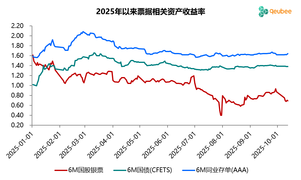 票据利率作为衡量信贷投放情况最灵敏的指标,从票据利率走势可以大致判断当月信贷投放情况。2025年9月,票据利率呈震荡上行走势,月初低开后小幅走低,随后开启上行,月末翘尾回落。9月首个工作日,6个月期限国股银票转贴现利率开盘于0.75%附近,随后小幅下探至0.72%后开启上行,先后突破0.80%和0.85%两个压力位,月底最高冲到0.93%,最后一天回落至0.87%。