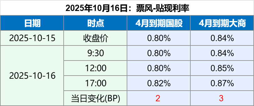 2025年10月16日 2025年10月16日,上午票据贴现利率稳定,下午小幅上涨,最新票据贴现利率如下: 备注:上述票据贴现价格全国可贴,无需重新开户。 如果您觉得上述贴现价格符合您的要求,可以扫描下方二维码联系我们。 文章导航 9月信贷环比改善,票据融资压降4000亿元
