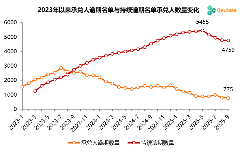 从上图来看,承兑人逾期名单承兑人数量在7月有所抬升后,8-9月继续步入下降通道,只是9月降幅有所放缓。自2023年3月首期持续逾期名单发布以来,两年时间已过累积效应逐渐消失,2023年纳入持续逾期的承兑人因不符合持续逾期的条件而陆续退出名单,自2025年6月开始持续逾期名单承兑人数量开始连续下降,9月降幅明显放缓。