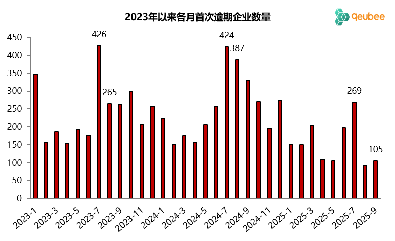 2025年9月首次承兑人逾期的企业数量为105家,较上月增加14家,依然处于历史较低水平。这再次说明6月和7月首次承兑人逾期企业数量上升并不具有持续性,当前商票逾期风险水平仍然偏低。