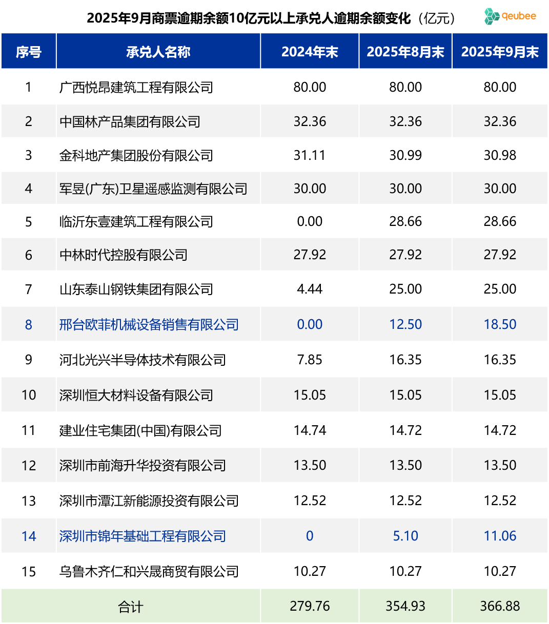 目前票据逾期名单上的企业主要以存量为主,即此前就已多次逾期,这些存量企业大部分票据逾期余额变化不大。2025年9月,构成2次以上逾期且已披露信息的承兑人中,票据逾期余额在10亿元以上的企业有15家,较上月新增1家,这15家企业商票逾期余额合计366.88亿元,较上月末增加11.95亿元。新增的一家承兑人为深圳市锦年基础工程有限公司,9月逾期余额增加5.96亿元至11.06亿元;此外,邢台欧菲机械设备销售有限公司9月逾期余额增加6.00亿元至18.50亿元,其他承兑人逾期余额基本没有变化。