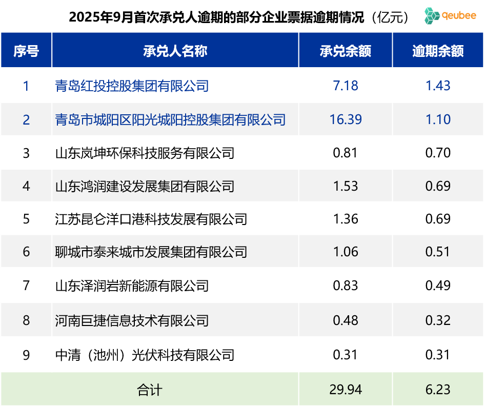 除了上述商票逾期余额10亿元以上企业,还需关注多次逾期承兑人中逾期余额增长较快的企业。2025年9月,中海外能源科技(山东)有限公司、青岛城阳开发投资集团有限公司、河北建设集团股份有限公司商票均再次出现逾期,逾期余额分别较8月末增加5.50亿元、2.35亿元、1.36亿元。