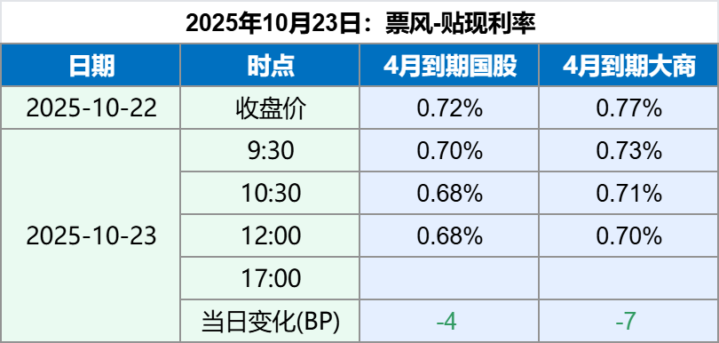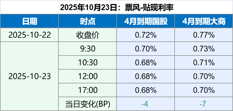 2025年10月23日 2025年10月23日,上午票据贴现利率继续下降,日内票据贴现利率变化如下: 备注:上述票据贴现价格全国可贴,无需重新开户。 如果您觉得上述贴现价格符合您的要求,可以扫描下方二维码联系我们。 文章导航 《票据法》修订工作取得积极进展!