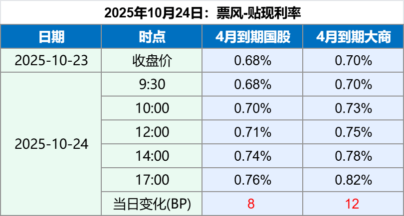 2025年10月24日,上午票据贴现利率显著反弹,下午继续上行,最新票据贴现利率如下: