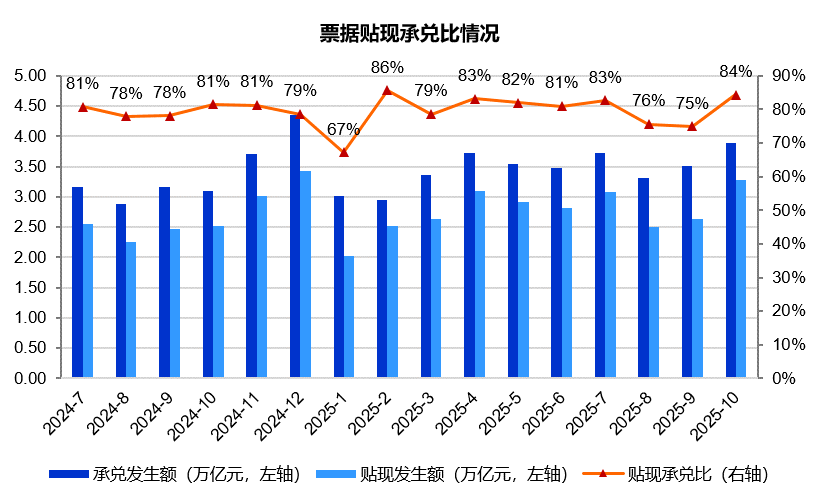 2025年10月,票据市场承兑发生额3.89万亿元,同比增长25.6%;贴现发生额3.28万亿元,同比增长30.1%。承兑与贴现量均保持高速增长,贴现承兑比为84%,较9月显著提升,为今年3月以来新高,高于去年同期的81%,票据市场再次呈现供不应求的状态。