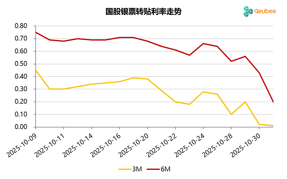 2025年10月,票据利率呈震荡下行走势,月末加速下行。10月首个工作日,6个月期限国股银票转贴现利率开盘于0.75%附近,第二日便下降至0.69%,随后在0.70%附近窄幅震荡多日,进入下旬,票据利率开启震荡下行,先后突破0.60%和0.50%两个压力位,月末最后两天跳水下行,6个月期限国股银票转贴现利率降至0.20%,3个月期限国股银票转贴现利率降至0.01%,皆创年内新低。