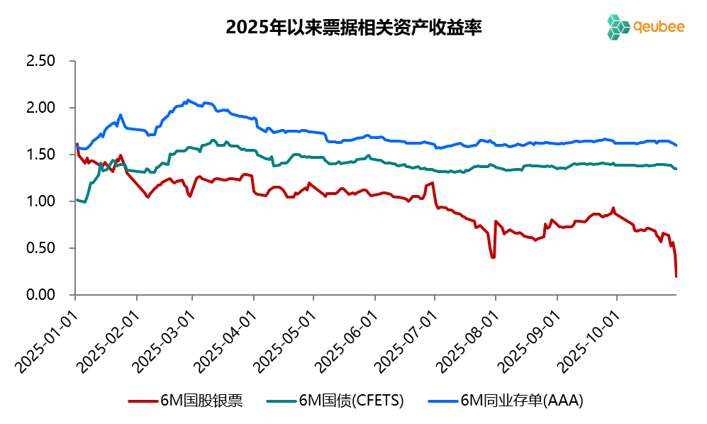 2025年10月,6个月期限国债、同业存单到期收益率小幅下行,分别较上月末下降4BP和2BP,而票据转贴现到期收益率则较上月末大幅下降67BP。本月票据利率继续在国债利率下方运行,利差显著扩大,月末票据与国债的利差为-115BP,票据与同业存单的利差为-140BP,利差创今年以来新高。