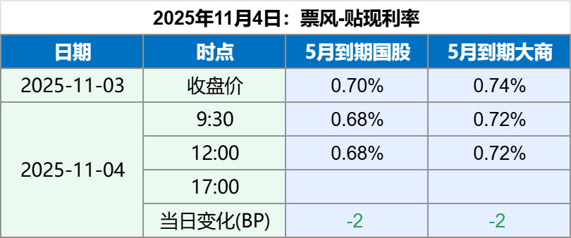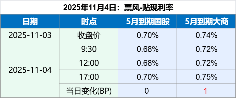 2025年11月4日 2025年11月4日,上午票据贴现利率略有下行,最新票据贴现利率如下: 备注:上述票据贴现价格全国可贴,无需重新开户。 如果您觉得上述贴现价格符合您的要求,可以扫描下方二维码联系我们。 文章导航 票据月评(10月):票据利率震荡下行,月末跳水