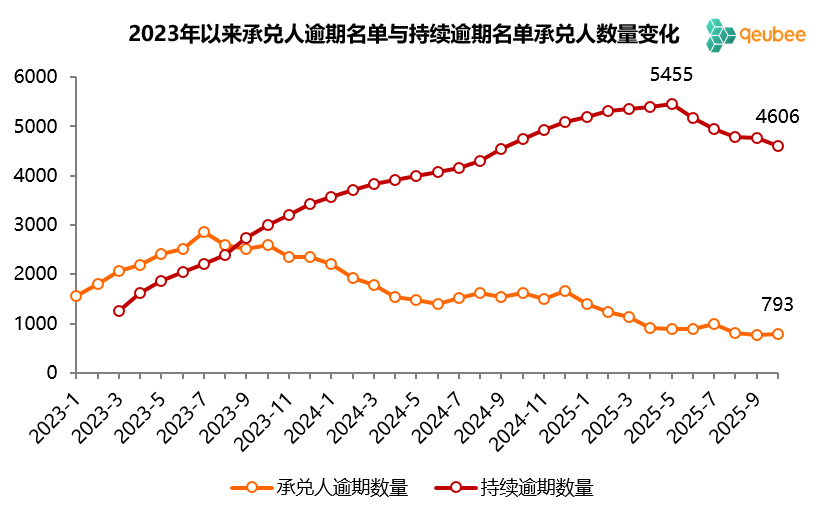 从上图来看,承兑人逾期名单承兑人数量近三个月维持在800家左右,较为平稳且处于2023年以来最低水平。自2023年3月首期持续逾期名单发布以来,两年时间过去累积效应逐渐消失,2023年纳入持续逾期的承兑人因不符合持续逾期的条件而陆续退出名单,自2025年6月开始持续逾期名单承兑人数量已连续4个月下降,待当月退出名单承兑人与新进承兑人数量相近时才会趋于平稳。