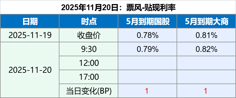 2025年11月20日 2025年11月20日,早盘票据贴现利率略有上行,最新票据贴现利率如下: 备注:上述票据贴现价格全国可贴,无需重新开户。 如果您觉得上述贴现价格符合您的要求,可以扫描下方二维码联系我们。 文章导航 社融口径下票据规模变化