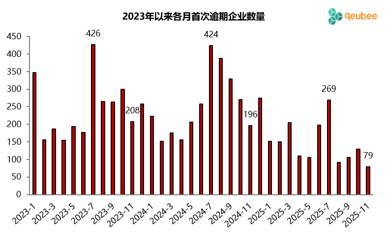2025年11月首次承兑人逾期的企业数量为79家,较上月下降50家,结束前两个月小幅上升势头,再次降至100家以内,为2023年以来最低水平,表明当前商票逾期风险处于较低水平。