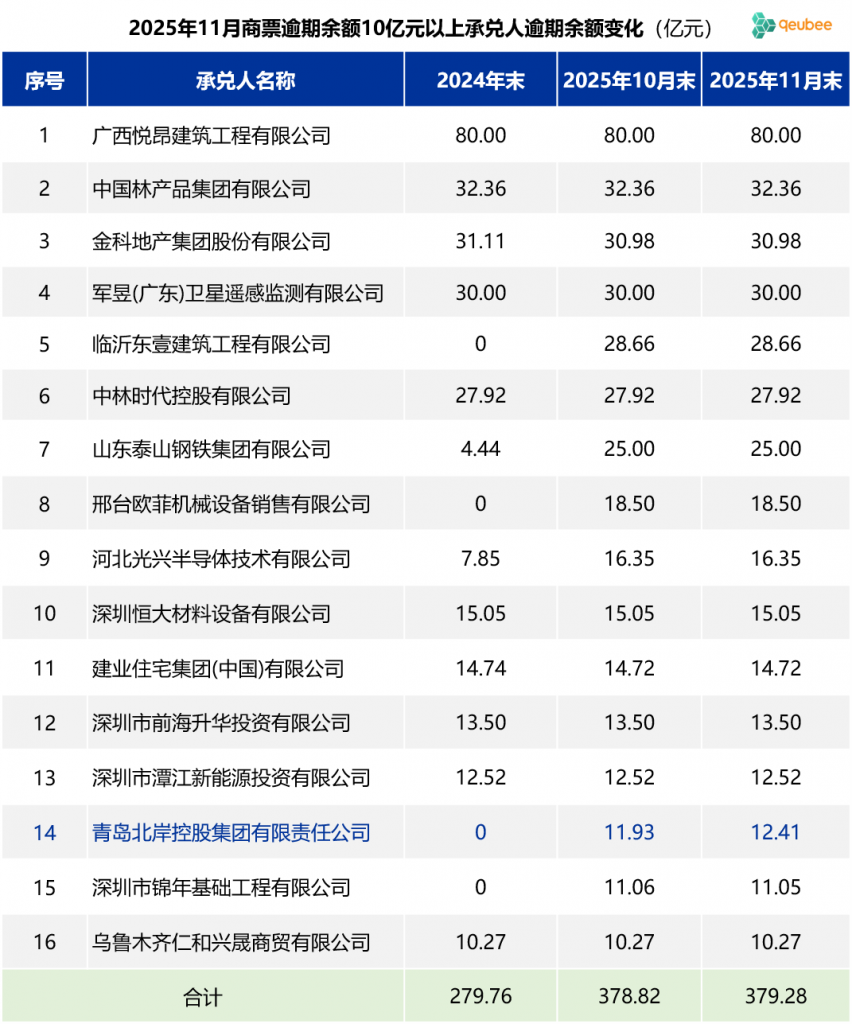 目前票据逾期名单上的企业主要以存量为主,即此前就已多次逾期,这些存量企业大部分票据逾期余额变化不大。2025年11月,构成2次以上逾期且已披露信息的承兑人中,票据逾期余额在10亿元以上的企业有16家,与上月持平,这16家企业商票逾期余额合计379.28亿元,较上月末增加0.47亿元,逾期余额增加主要源于青岛北岸控股集团有限责任公司,其他承兑人逾期余额基本没有变化。