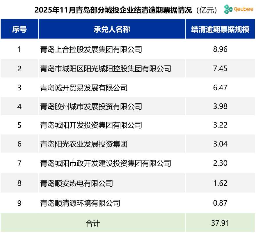 2025年9月和10月,青岛地区多家企业出现商票逾期,其中不少为城投企业。11月,青岛地区新增逾期企业数量有所减少;而且,此前商票逾期金额较高的城投公司或子公司陆续结清逾期商票,如青岛上合控股发展集团有限公司、青岛市城阳区阳光城阳控股集团有限公司、青岛诚开贸易发展有限公司等,总结清逾期商票超过37亿元,部分城投企业逾期票据结清情况如下: