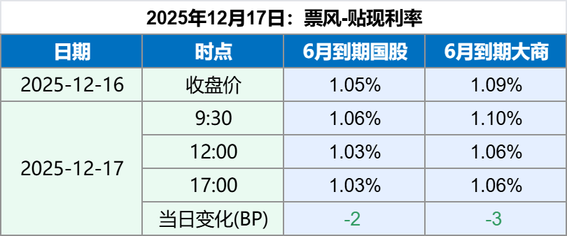 2025年12月17日,早盘票据贴现利率略有上升,上午小幅下降,下午保持稳定,最新票据贴现利率如下: