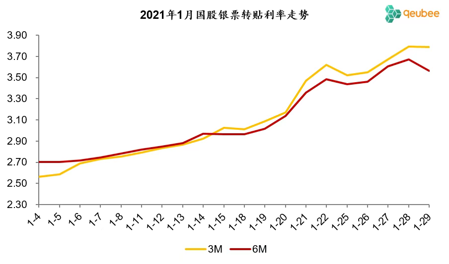2021年1月,票据利率呈单边上行走势,6个月期限国股银票转贴现利率在2.70%-3.67%之间,波动幅度97BP,月内升幅86BP,1月首个工作日高开18BP。大部分时间3个月与6个月期限票据利率相近。