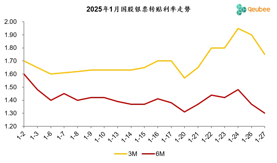 2025年1月,票据利率月初下行,随后震荡,月末小幅上行后回落,6个月期限国股银票转贴现利率在1.30%-1.60%之间波动,波动幅度30BP,月内降幅30BP,与长期限票据利率下行不同,短期票据利率呈上行走势。因2024年底票据利率大幅翘尾回落,1月首个工作日依然大幅高开30BP。3个月期限票据利率全月位于6个月期限票据利率上方,利差显著高于往年同期。