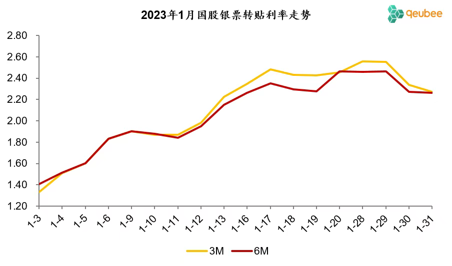 2023年1月,票据利率呈震荡上行走势,月末小幅回落,6个月期限国股银票转贴现利率在1.41%-2.46%之间,波动幅度105BP,月内升幅86BP。因2022年底票据利率大幅走高,1月首个工作日同样未高开。前半个月3个月与6个月期限票据利率相近,后半个月3个月期限票据利率稍高于6个月。