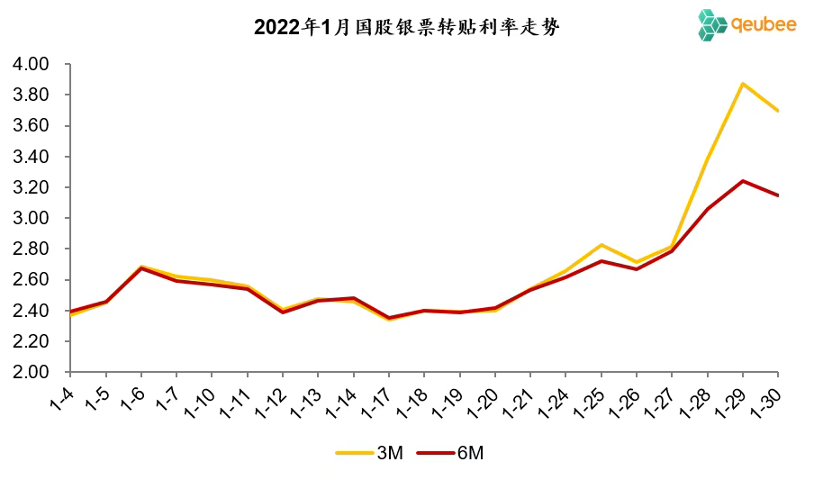 2022年1月,票据利率月初走高后回落,月末翘尾,6个月期限国股银票转贴现利率在2.35%-3.24%之间,波动幅度89BP,月内升幅76BP。因2021年底票据利率大幅走高,1月首个工作日并未高开。大部分时间3个月与6个月期限票据利率相近,月末3个月期限票据利率来到上方。