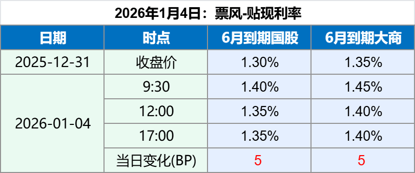 2026年1月4日 2026年1月4日,早盘票据贴现利率大幅上升,上午回落,下午保持稳定,最新票据贴现利率如下: 备注:上述票据贴现价格全国可贴,无需重新开户。 如果您觉得上述贴现价格符合您的要求,可以扫描下方二维码联系我们。 文章导航 2025年12月31日票据贴现利率 2026年1月5日票据贴现利率