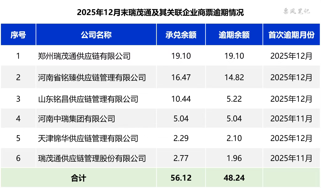 2026年1月9日,上海票据交易所公布2025年12月票据承兑人逾期名单,瑞茂通及其关联企业排名前列,据不完全统计,2025年末其商票逾期余额超过48亿元,为2024年以来商票逾期规模最高的大型企业。