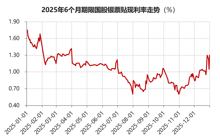 2025年,票据贴现利率1-10月震荡下行,11-12月回升,6个月期限国股银票贴现利率的波动区间是0.60%-1.75%,利率中枢是1.05%附近,期间票据贴现利率走势如下: