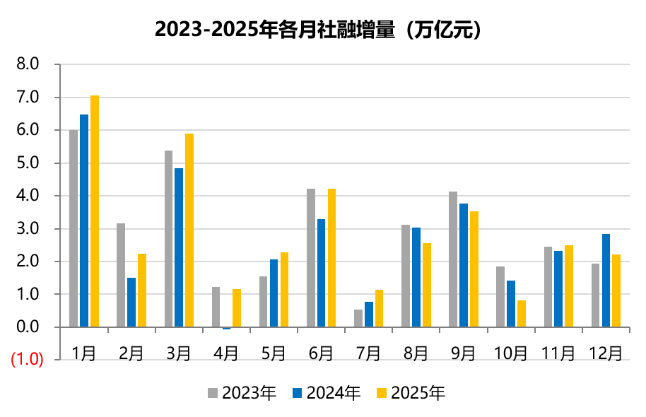 社会融资规模是当前监管部门关注的核心指标,从2023 – 2025年月度社会融资规模增量情况来看(见下图),社融增量总体上是逐季走低的趋势。相对而言,每年2月、4月、7月、10月社融增量在对应季度都是最低的,贷款和社融往往高度同步变化,而这造就了票据利率年内呈现规律性波动的内在动因。