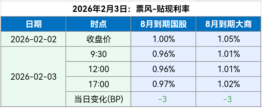 2026年2月3日,早盘票据贴现利率大幅下行,上午保持稳定,下午略有回升,最新票据贴现利率如下: