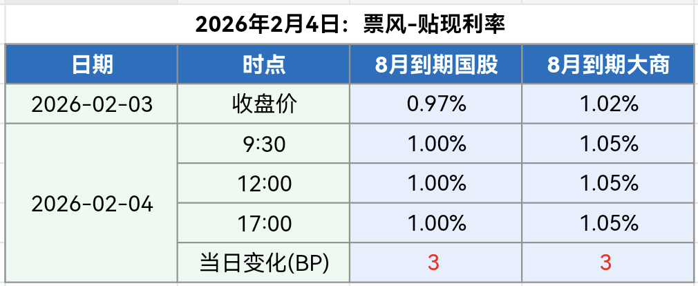 2026年2月4日 2026年2月4日,早盘票据贴现利率小幅上涨,全天维持,最新票据贴现利率如下: 备注:上述票据贴现价格全国可贴,无需重新开户。 如果您觉得上述贴现价格符合您的要求,可以扫描下方二维码联系我们。 文章导航 2026年2月3日票据贴现利率