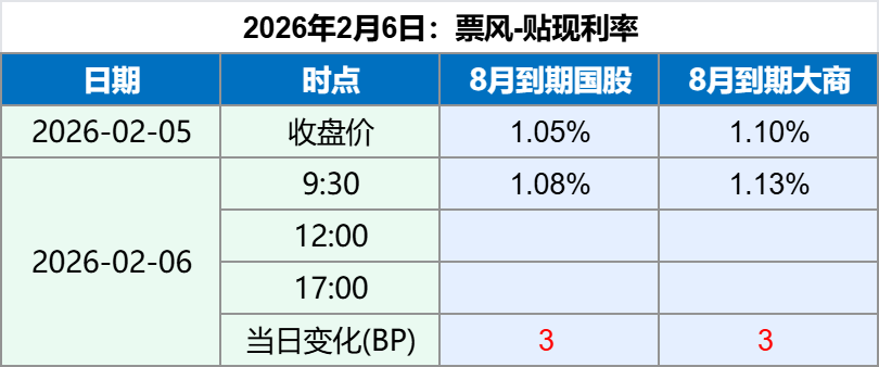 2026年2月6日 2026年2月6日,早盘票据贴现利率小幅上行,最新票据贴现利率如下: 备注:上述票据贴现价格全国可贴,无需重新开户。 如果您觉得上述贴现价格符合您的要求,可以扫描下方二维码联系我们。 文章导航 票交所:优化票据信息披露有关事项