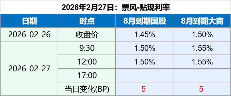 2026年2月27日 2026年2月27日,早盘票据贴现利率大幅上行,最新票据贴现利率如下: 备注:上述票据贴现价格全国可贴,无需重新开户。 如果您觉得上述贴现价格符合您的要求,可以扫描下方二维码联系我们。 文章导航 票据利率创年内新高至1.33%,击穿国债利率!