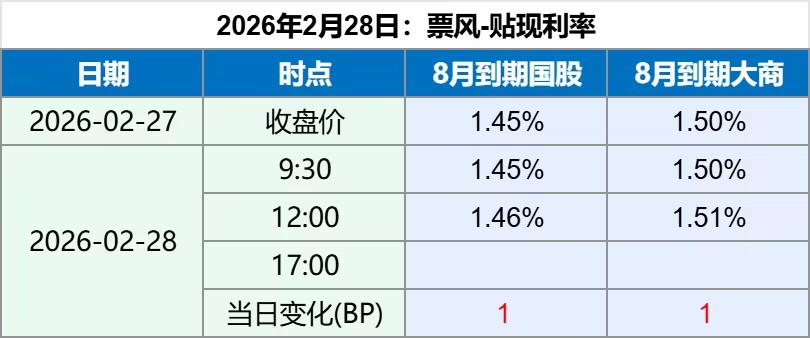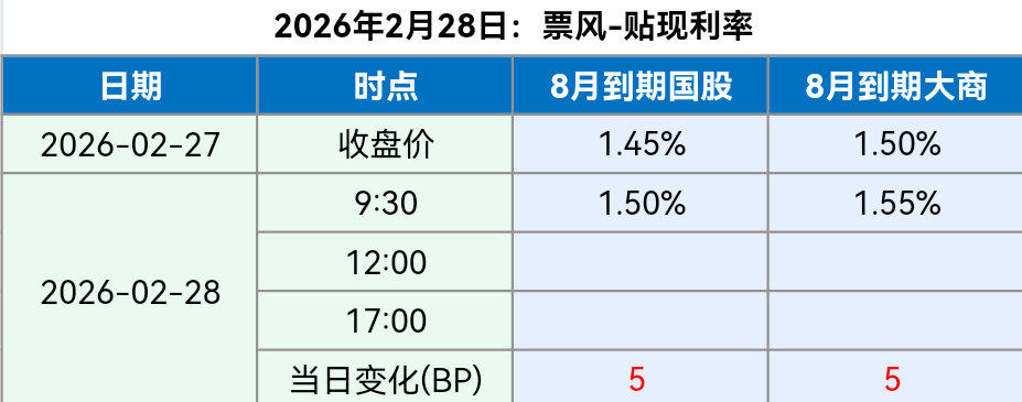 2026年2月28日 2026年2月28日,早盘票据贴现利率大幅上行,最新票据贴现利率如下: 备注:上述票据贴现价格全国可贴,无需重新开户。 如果您觉得上述贴现价格符合您的要求,可以扫描下方二维码联系我们。 文章导航 2026年2月27日票据贴现利率