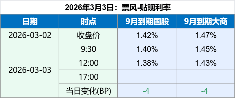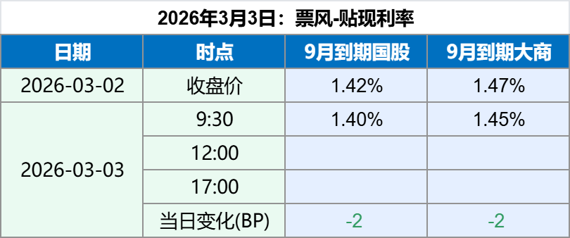 2026年3月3日 2026年3月3日,早盘票据贴现利率略有下行,最新票据贴现利率如下: 备注:上述票据贴现价格全国可贴,无需重新开户。 如果您觉得上述贴现价格符合您的要求,可以扫描下方二维码联系我们。 文章导航 2026年3月2日票据贴现利率 历年3月票据利率走势回顾:震荡居多