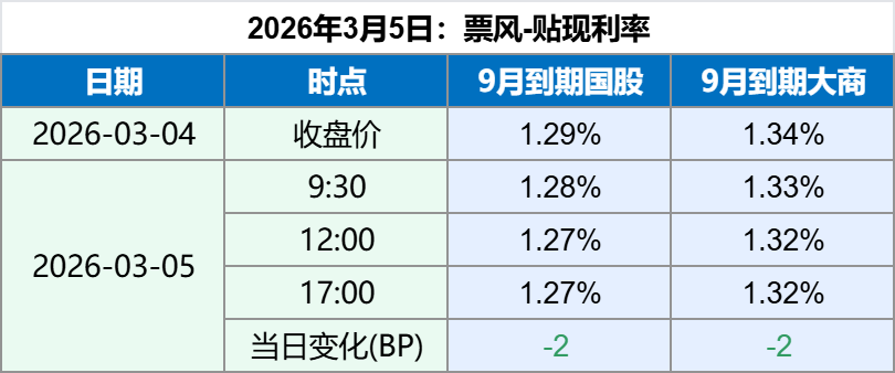 2026年3月5日,上午票据贴现利率持续下行,下午维持稳定,最新票据贴现利率如下: