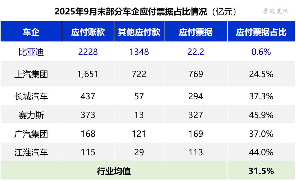 根据比亚迪财报披露,2025年9月末,比亚迪应付账款余额为2228亿元,其他应付款余额1348亿元,而应付票据余额仅为22.2亿元,应付票据占比仅0.6%,应付票据中商票余额更低。可以说在2025年9月之前比亚迪票据的使用率极低。