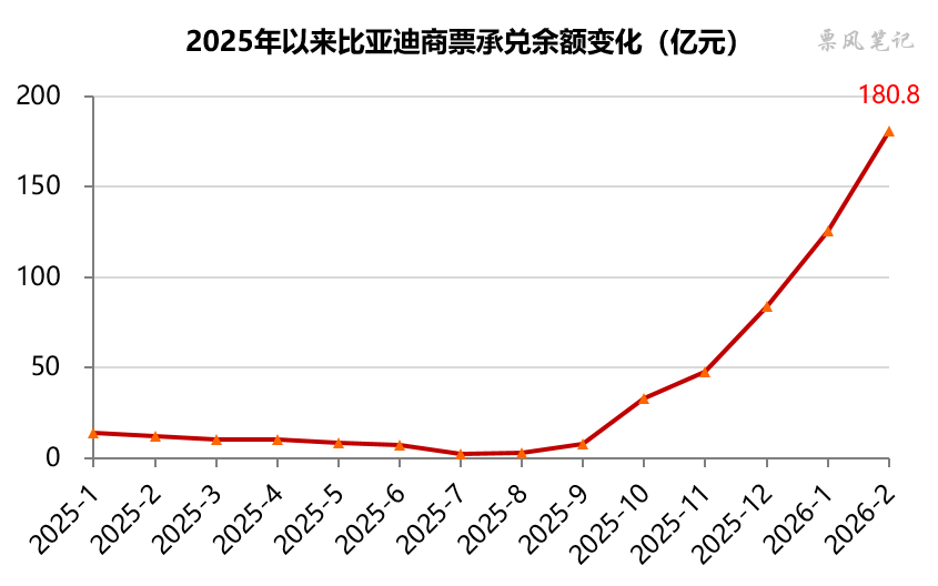 经过5个月商票签发量的增长,截至2026年2月末,比亚迪汽车工业有限公司商票承兑余额增长至180.8亿元,较上月末增长55.4亿元,较2025年9月末增长172.7亿元。按目前趋势,比亚迪商票承兑余额仍将继续上升。