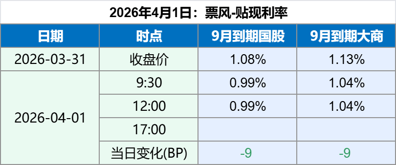 2026年4月1日,早盘票据贴现利率大幅下行,上午维持,最新票据贴现利率如下:
