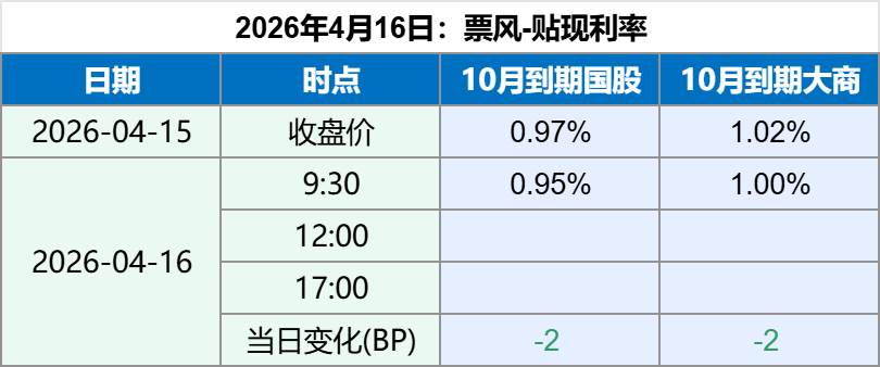 2026年4月16日 2026年4月16日,早盘票据贴现利率小幅下行,最新票据贴现利率如下: 备注:上述票据贴现价格全国可贴,无需重新开户。 如果您觉得上述贴现价格符合您的要求,可以扫描下方二维码联系我们。 文章导航 2026年4月15日票据贴现利率