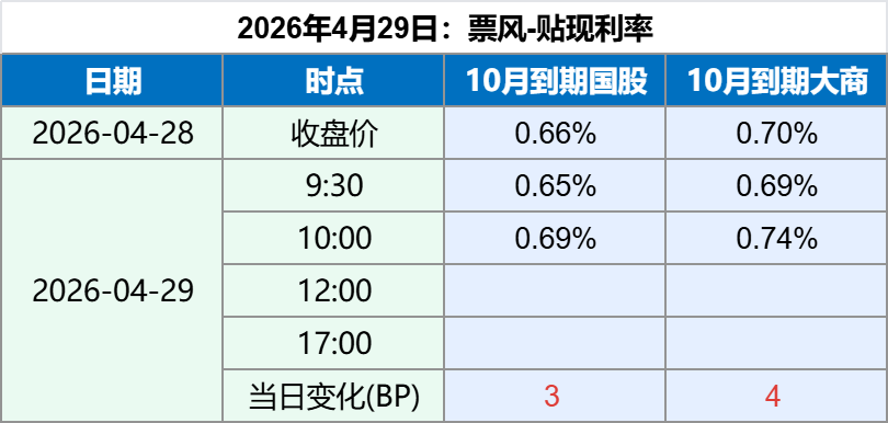 2026年4月29日,早盘票据贴现利率略有下行,随后大幅回升,最新票据贴现利率如下: